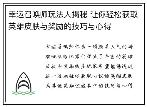 幸运召唤师玩法大揭秘 让你轻松获取英雄皮肤与奖励的技巧与心得