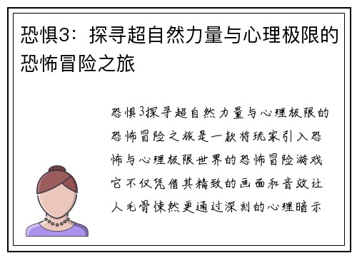 恐惧3:探寻超自然力量与心理极限的恐怖冒险之旅